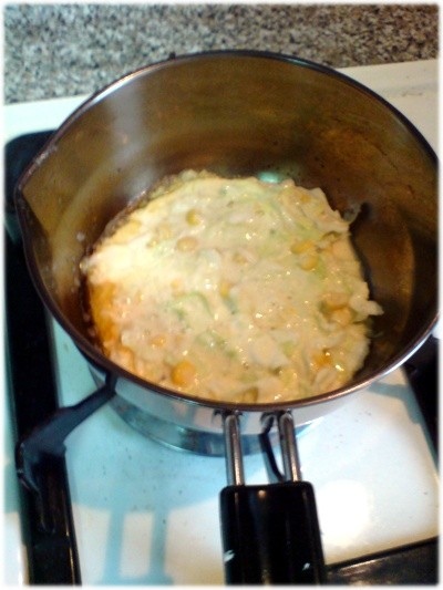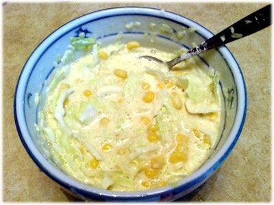 再把高麗菜..玉米粒..G蛋及1小匙塩通通加進去一起攪和