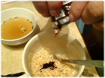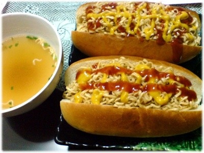 將麵條裝入烤好的大亨堡中..最後再淋上喜愛的調味包就大功告成了!!
